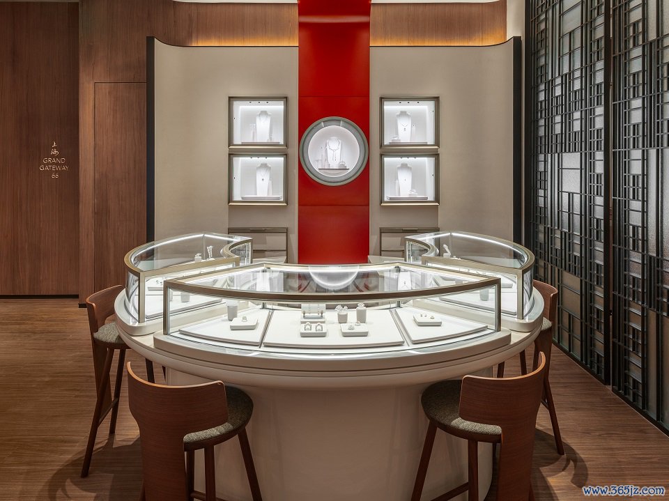 步入店内,轩敞空间趁势铺展,圆弧展柜沿畅通动线参差排布,指挥顾主在藏身与轻视溜达间,感受珠宝细致肌理。络续真切探索,中央展示区营造出艺廊般的典雅环境,落地展示柜柔柔镶嵌卷轴形墙面,线条婉转舒展,使顾主如不雅展般开启探索与互动之旅。视野进取蔓延,天花板与灯光在视觉上延展了空间的垂直纵深,突破了传统零卖空间的空洞。店铺更以优雅弧线了了勾画出不同产物区域,进一步升华空间体验的头绪与质感。